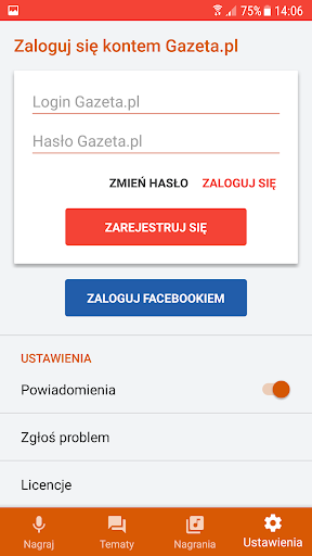 Для отправки записей из приложения необходимо войти в учетную запись Gazeta PL. Если у вас нет такой учетной записи, вы можете создавать их в приложении или войти в свою учетную запись Facebook.