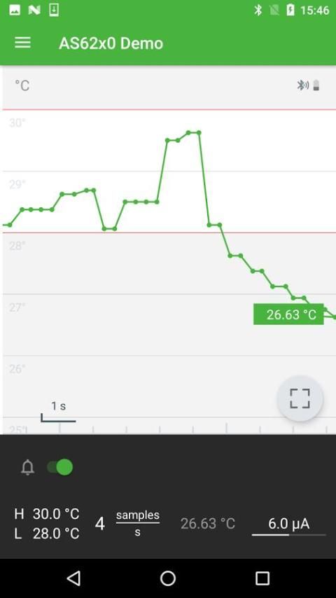 АМС AS62x0 Температурный датчик App позволяет взаимодействовать с помощью кнопки AS62x0 Demo. Она позволяет изменять все доступные параметры и изучить полный набор функций датчика.