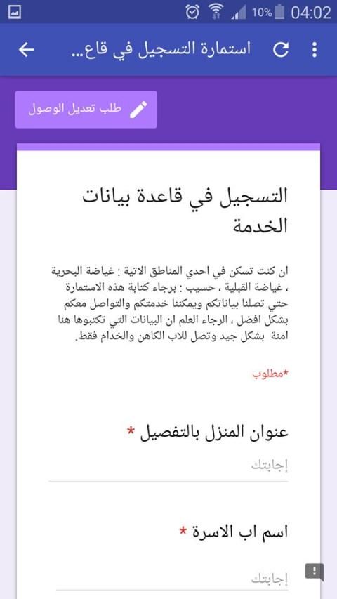استمارة التسجيل في قاعدة بيانات الخدمة