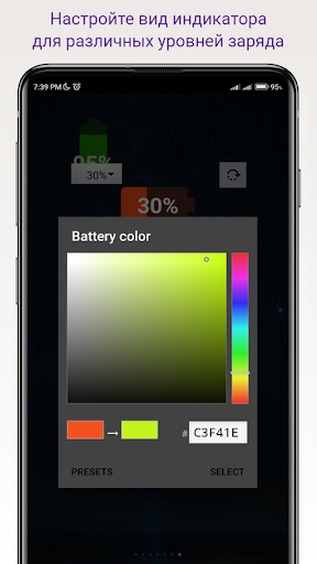 Вы можете выбрать любой цвет для разных уровней заряда батареи в настройках приложения.