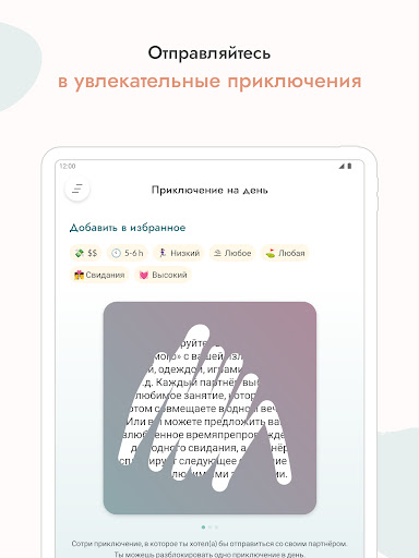 Открой для себя крутые идеи приключений для пар 🏔. Благодаря этой функции у тебя всегда будут идеи для следующего свидания. Просто выбери приключение, которое тебе нравиться, сохрани его на потом или выполни его сейчас! Не забудь сфотографировать самые смешные моменты.