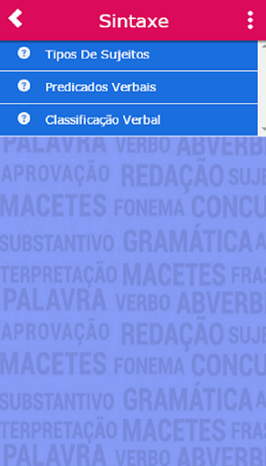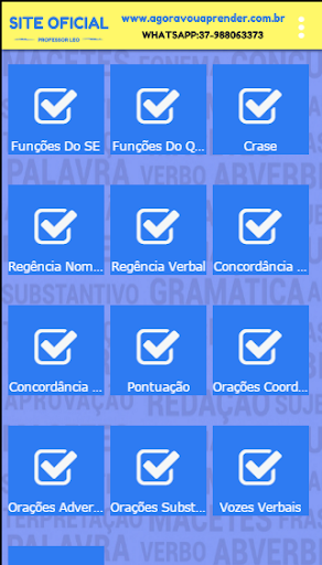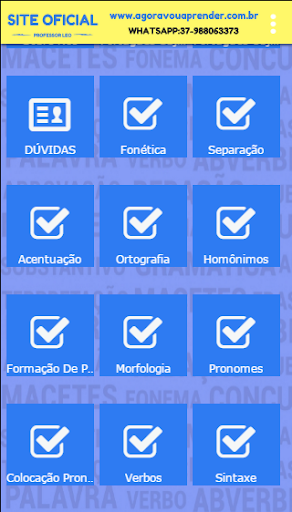 São 24 matérias e dezenas de assuntos para você entender o português de forma clara e objetiva. Há simulados de: FONÉTICA - SEPARAÇÃO SILÁBICA - ACENTUAÇÃO - HOMÔNIMOS E PARÔNIMOS - ORTOGRAFIA - CRASE - REGÊNCIA VERBAL - REGÊNCIA NOMINAL - PRONOMES - VERBOS - VOZES VERBAIS - SINTAXE - COLOCAÇÃO PRONOMINAL - PONTUAÇÃO - CONCORDÂNCIA VERBAL - CONCORDÂNCIA NOMINAL - ORAÇÕES COORDENADAS - ORAÇÕES ADVERBIAIS - ORAÇÕES SUBSTANTIVAS - FIGURAS DE LINGUAGEM - FUNÇÕES DO SE - FUNÇÕES DO QUE.