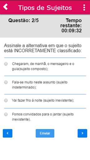 Revise a matéria de português por meio de vários simulados separados por matéria e também por assunto. Saiba se você foi aprovado e qual a sua porcentagem em cada assunto. No aplicativo simulados de português, você terá 10 minutos para responder 5 questões e caso queira refazer o simulado, as questões são reordenadas para melhor aproveitamento.