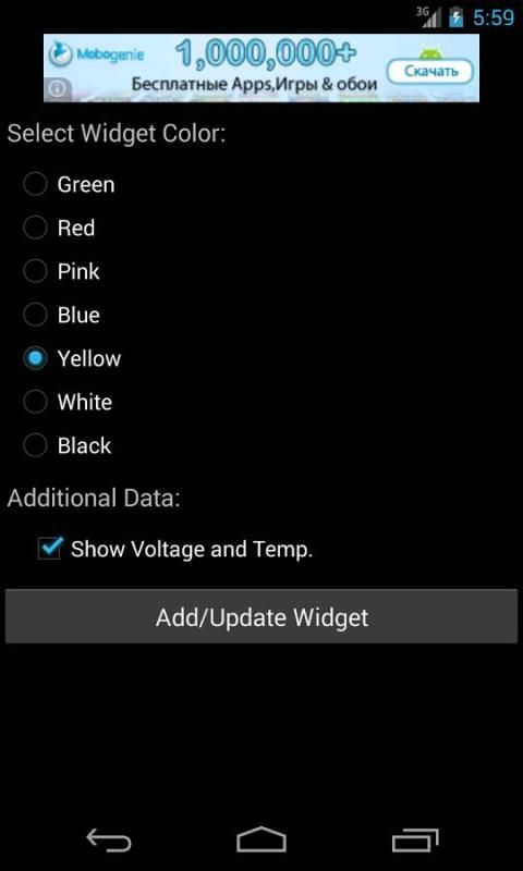 Чтобы добавить виджет нажмите: Главная-> Menu-> Add-> Виджеты-> Glow Аккумулятор Виджет.