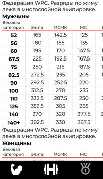 4)Встроена таблица нормативов в экипировке и без нее для всех популярных федераций пауэрлифтинга (WPC, WPA, IPA)