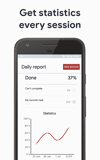 > Вам будет представлена статистика за прошедшую сессию, где вы можете увидеть, сколько было сделано по каждой задаче. Все задачи, которые вы не успели сделать автоматически переносятся в ваш основной список задач. Оттуда вы нажатием одной кнопки можете перенести задачу в «Сегодняшние задачи»