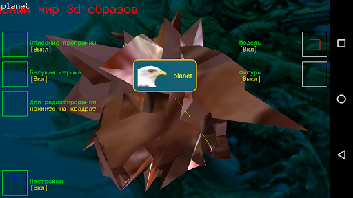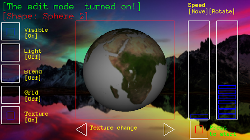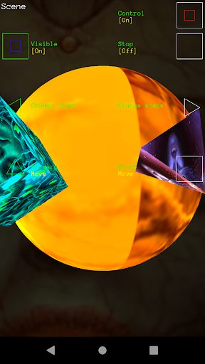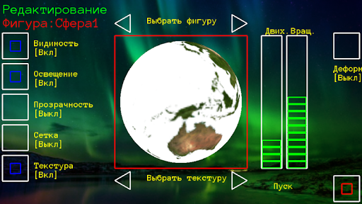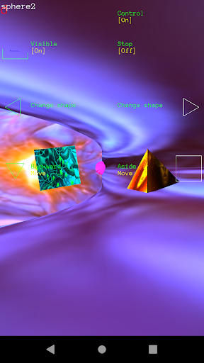 При старте программы на сцене появляется 3D модель и фигуры (пирамида, куб, 2 сферы) . Фигуры и 3D модель находятся в движении. Управлять можно только активной фигурой. Для активации фигуры необходимо её коснуться. Активная фигура или 3D модель управляется листанием по горизонтали и вертикали, а также в режиме "Управление" соответствующими кнопками ("Видимость", "В сторону","Прямо","Остановить"). Так же имеются кнопки для перехода в режим редактирования ("Редактирование") и помощи ("Помощь") .