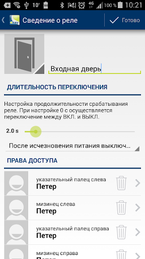 - Настройка доступа и времени срабатывания реле