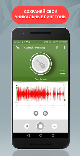 CutTrack - это самое простое и удобное приложение для обрезки песен. Вы можете с легкостью вырезать понравившеюся часть аудио трека. Обрезка песен дает возможность создать уникальные мелодии звонка, мелодии для текстовых уведомлений или мелодии будильника которые будут дарить вам хорошее настроение. Мы разработали крутой интуитивно понятный дизайн с которым вырезать музыку очень легко, вы например можете вырезать припев песни на звонок. С нашим приложением можно редактировать музыку в формате mp3, это стоит попробовать. CutTrack - это хороший инструмент для быстрой нарезки песен на вашем Android смартфоне.