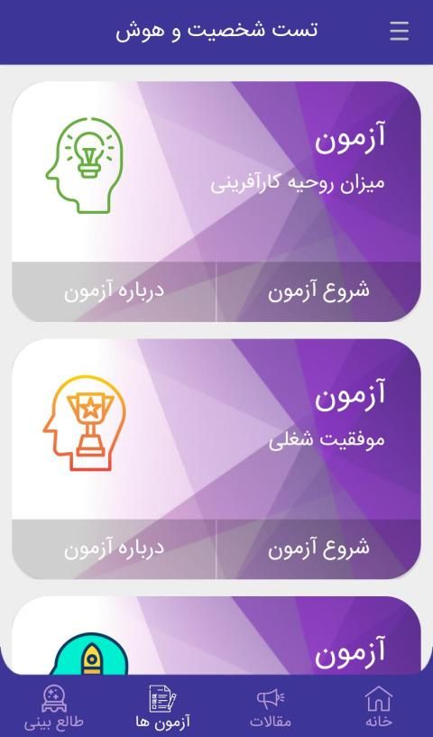 در تب آزمونها لیستی از معتبرترین آزمون های روانشناسی و همچنین آزمون های هوش و برخی تست های سرگرمی را مشاهده می‌کنیم که به صورت رایگان در اختیار کاربران قرار داده شده است. از جمله این آزمون ها، آزمون MBTI، آزمون شخصیت شناسی نئو و آزمون رغبت سنجی شغلی هالند می باشد.