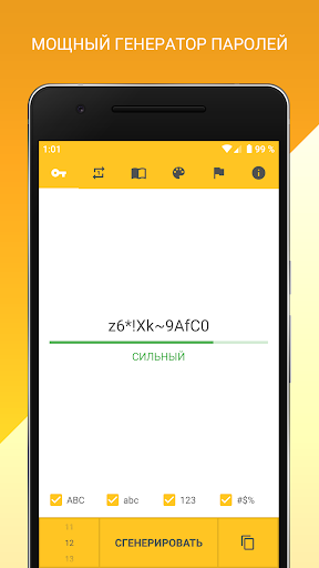 Настройки для генерации включают в себя буквы верхнего и нижнего регистров, числа, спецсимволы и длину пароля. Приложение подскажет вам, насколько надежный пароль вы сгенерировали: «мощность» отображается на анимированной полоске.