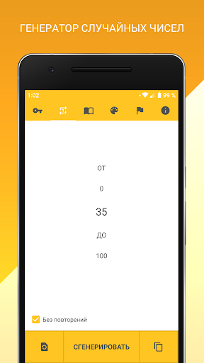 Укажите положительные и/или отрицательные числа в полях «от» и «до». Теперь, нажав «Сгенерировать», вы получите случайное число в заданном диапазоне. Функция «Без повторений» исключает дублирование чисел.