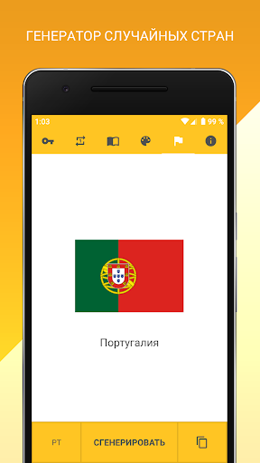 По официальным данным в мире насчитывается 195 стран. В приложении вы можете сгенерировать случайную страну из этого списка и ее красочный флаг.