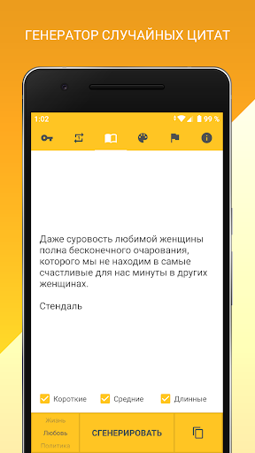 В приложении представлена огромная библиотека высказываний известных личностей. В настройках выбирается нужная длина случайной цитаты: короткая, средняя или длинная, а также тема. Можно генерировать случайные цитаты на абсолютно разные темы.
