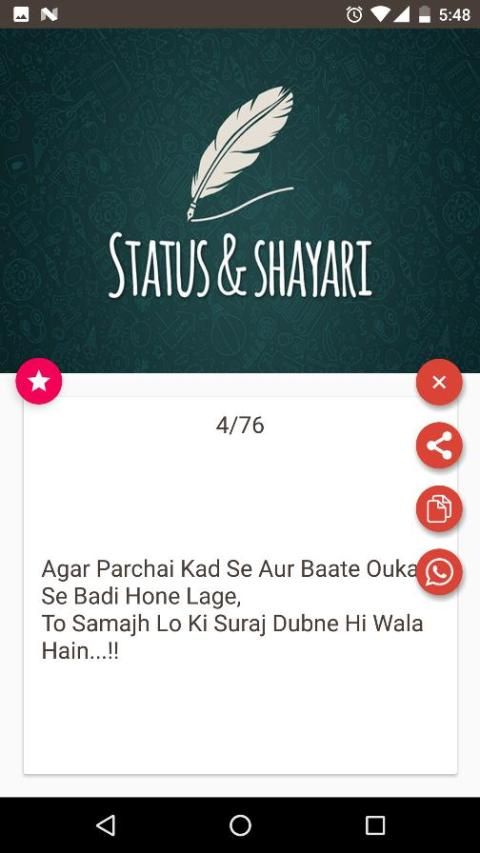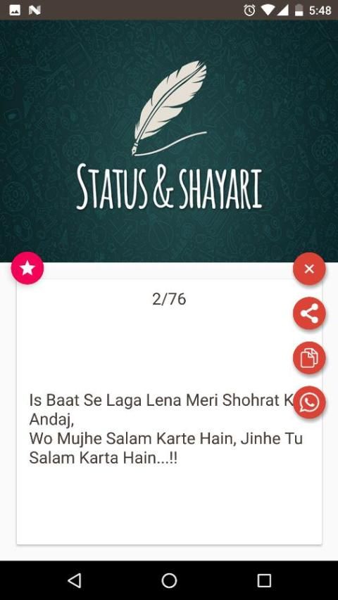 Отношение это великое чувство. Люди могут быть счастливым или грустным с вашим отношением. Если у вас есть социальный профиль в социальных сетях, то это приложение поможет вам разобраться в кризис статуса. статус Отношение включает в себя статус жизни, качалки, мне статус, я люблю меня, и многое другое. Он имеет английском и хинди статус.