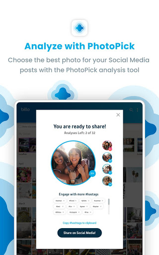 PhotoPick: Choose the best photo for your Instagram posts with the PhotoPick analysis toolSync your Social Media posts: You can archive photos you share on Facebook and Instagram to Billo.