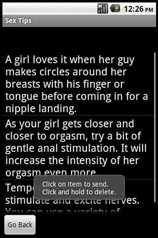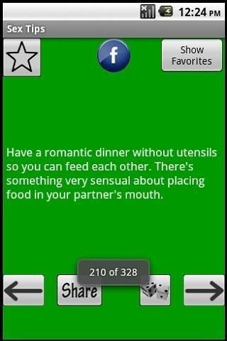 100's of tips to help you become a better lover. "A girl loves it when her guy lightly bites her nipples while touching her down below. This combination will drive your girl crazy with pleasure." Features: Favorites Sharing Tips (Facebook,Twitter,SMS,ect...) App2SD
