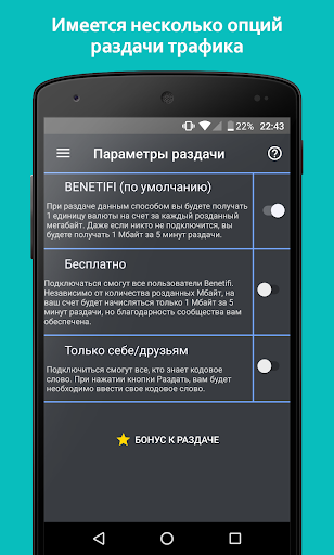 • Опция «BENETIFI» позволяет пользователю получать за каждый розданный мегабайт 1 ед. валюты на свой баланс. Также начисляется бонус за каждые 5 минут раздачи.