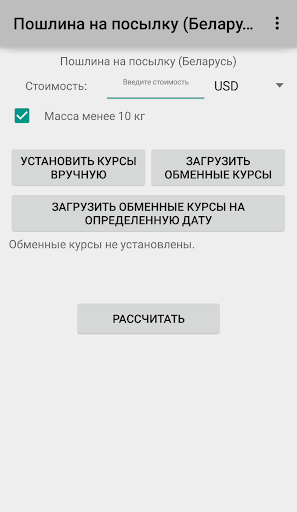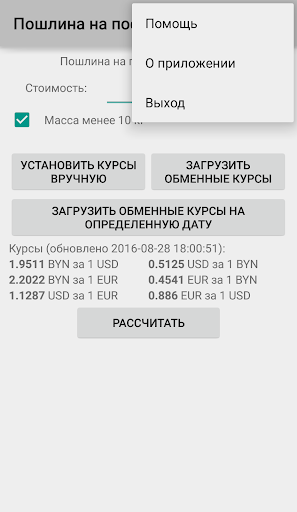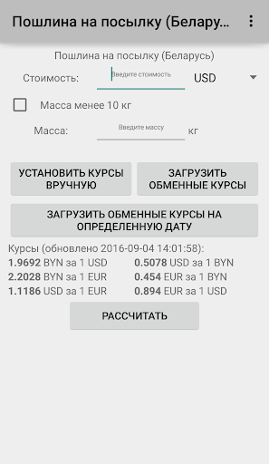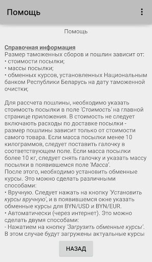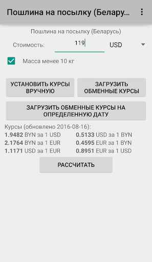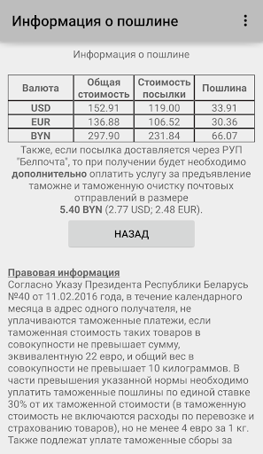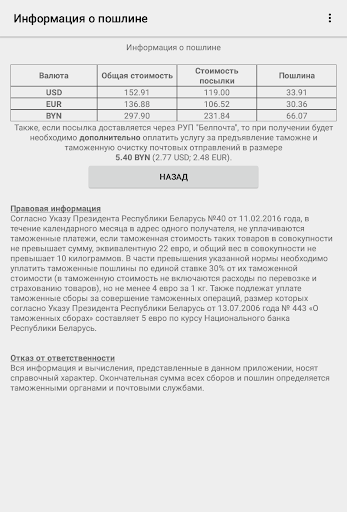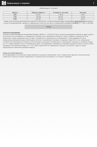 С помощью данного приложения можно произвести рассчет таможенных сборов, пошлин и налогов на посылки, которые поступают в Беларусь из-за рубежа. Например, покупки из зарубежных интернет-магазинов и торговых площадок, присылаемые покупателям по почте в РБ. В приложении отсутствует реклама.