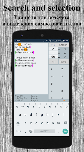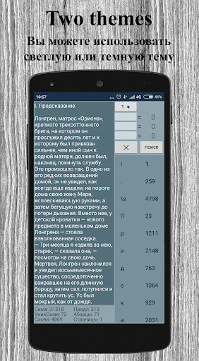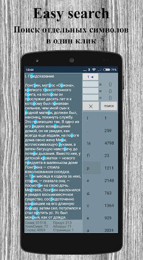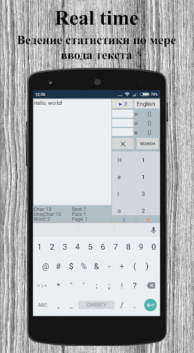 Приложение ведет статистику текста: общее количество символов, количество уникальных символов, количество слов, предложений, абзацев, страниц, а также количество повторений каждого символа.