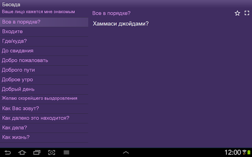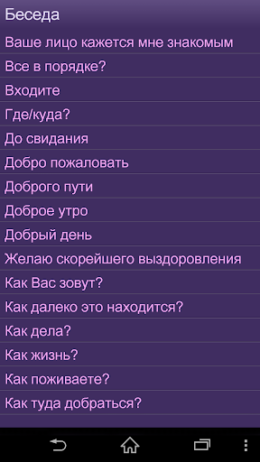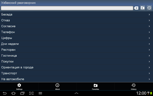 Бесплатный Узбекский разговорник предназначен для тех, кто не очень хорошо владеет Узбекском языком, он упростит общение и взаимопонимание. Справочник работает в режиме ОФФЛАЙН и не требует интернет-соединения для работы.