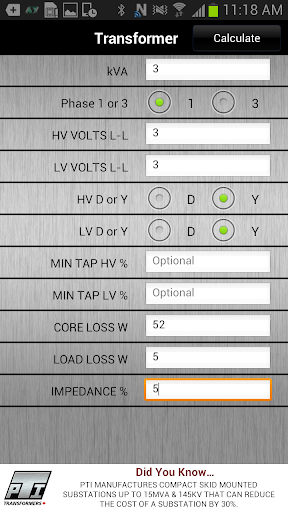 PTI «Transform» Er рассчитывает ток электрического трансформатора, фазовое напряжение, эффективность и регулирование при различных нагрузках и факторах мощности и обеспечивает преобразования Si / Metric для скорости, силы, мощности, площади, давления, объема, температуры, веса и мер.Удобный калькулятор для определения даты корабля с любой даты с использованием недель после порядка (ARO) также включен.Интересные факты о PTI и то, что мы видим, когда вы перемещаетесь по приложению.