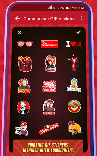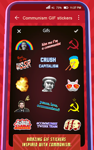 Коммунизм определяется как политическая и экономическая доктрина, целью которой является замена частной собственности и основанной на прибыли экономики общественной собственностью. Если вы хотите узнать, почему коммунизм плох или что хорошего в коммунизме, начните с загрузки этих бесплатных стикеров GIF-приложения. Коммунизм GIF Приложение - Анимированные Наклейки - это крутой фоторедактор, который украсит ваши фотографии и обеспечит свободное время. Получить красивые фото наклейки, предназначенные специально для всех коммунистических людей. Каждая наклейка - произведение искусства удивительного дизайна коммунизма! Превратите свои фотографии в коммунистические творения с помощью этих бесплатных наклеек. Нанесение этих наклеек GIF очень просто и идеально подходит для того, чтобы придать вашим фотографиям мгновенный коммунистический вид. Скачайте и создайте уникальный шедевр, используя эти стикеры GIF для фотографий. Эти наклейки - идеальный способ украсить ваши фотографии. Получите приложение Коммунизм GIF Приложение - Анимированные Наклейки и покажите свою преданность коммунизму