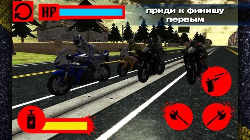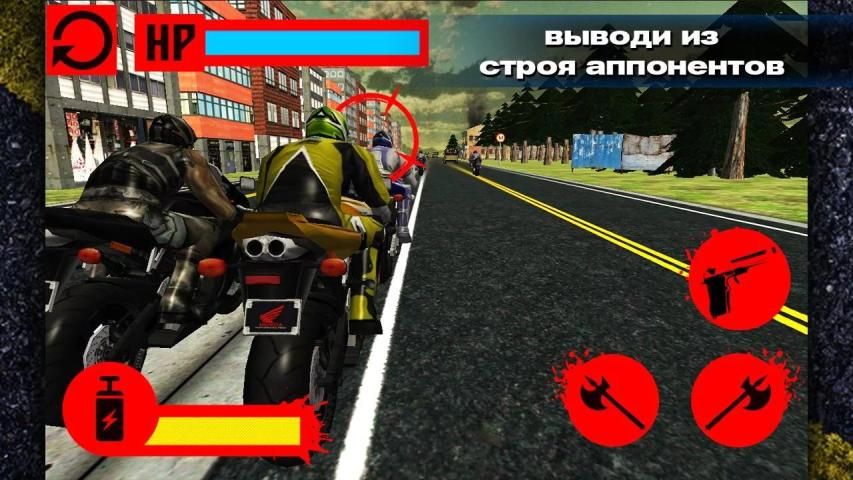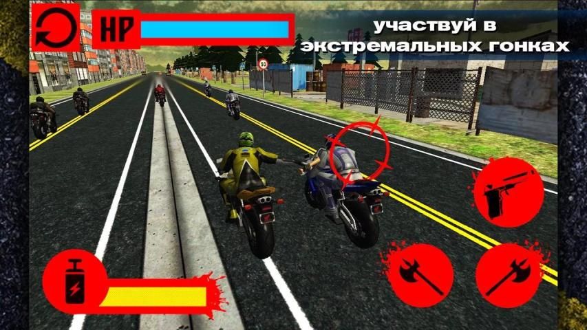 Вы участвуете в смертельной гонке на мотоциклах локо. Позади соперники с битами, пушками, палками и цепями. Они хотят вас скинуть с мотоцикла. У вас тоже есть оружие. Вы можете скидывать с мотоцикла других байкеров. В это смертельной гонке на мотоциклах локо нет правил. Полиция ваш враг, они будут вам мешать участвовать в смертельной гонки на мотоциклах локо. Вы должны быть быстрее чем они. Вы должны обогнать всех соперников. Но осторожно, на дороге вам будут мешать грузовики, грузовики нужно объезжать. Если ты врежешься в грузовик, то проиграешь.