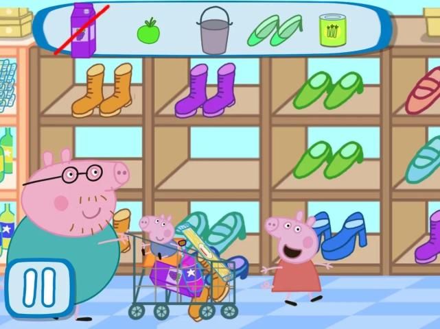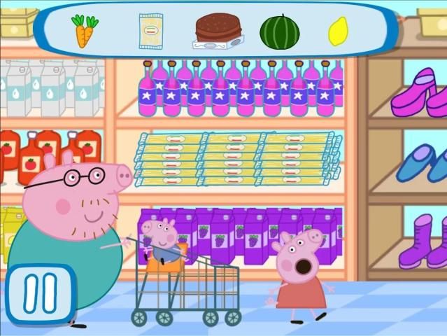 Мама Свинка составила список товаров которые необходимо купить в супермаркете. Папа Свин, Джордж и свинка Пеппа взяли тележку и отправились в супермаркет искать товары, которые мама Свинка внесла в список покупок. В верхней части экрана расположен список необходимых товаров. Помогите свинке Пеппе найти все товары которые есть в списке. Внимательно следите за витринами и когда увидите товар который есть у вас в списке - кладите его в корзинку. Не забывайте следить за папой Свином и Джорджом, они все время стараются закинуть в корзину что-то лишнее.
