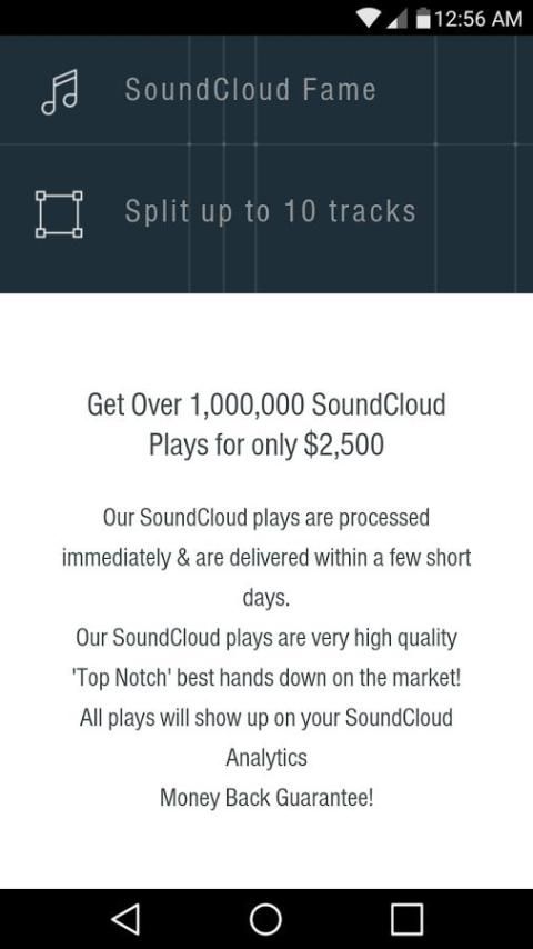 С помощью этого приложения вы можете приобрести высокое качество "Top Notch" самые лучшие игры SoundCloud гарантируется. Пьесы можно увидеть на ваших аналитику. Все заказы обрабатываются немедленно и доставляются в течение нескольких коротких дней. Это руки вниз лучший способ для продвижения вашего профиля SoundCloud. Единственный способ сделать в музыкальной индустрии, инвестируя в себя. Reach миллионы и миллионы людей во всем мире, готовы играть в ваши SoundCloud треки. Гарантия возврата денег! 100% удовлетворение.