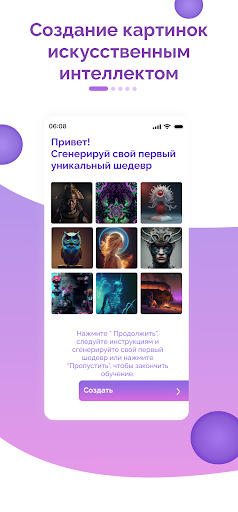 С помощью нашего креативного приложения, Вы можете генерировать картинки искуственным интелектом , что дает возможность делать их уникальными и завороиющим произведением искусства. То есть, Вы реальный художник.