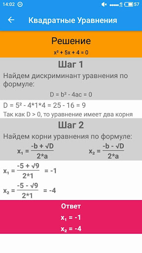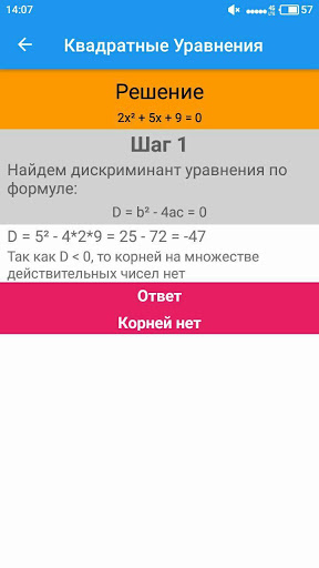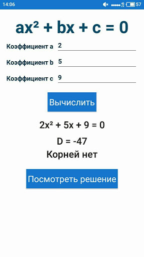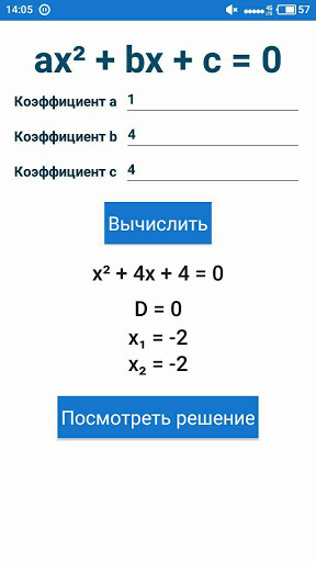Приложение поможет вам найти корни квадратного уравнения по квадратной формуле. Оно облегчит вашу школьную жизнь, поможет решить уравнение быстро и правильно.