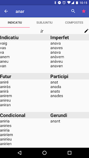 Спряжение 8500 каталонских глаголов с переводом на английский и испанский. Все формы глаголов. Глаголы могут быть добавлены в избранное, для того чтобы иметь быстрый доступ к ним, не использует интернет для спряжение и поиска глаголов.