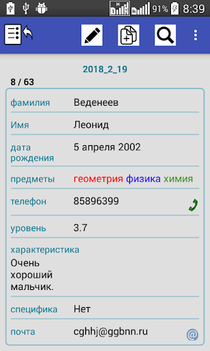 Данное приложение является упрощенной универсальной базой данных, которая ориентирована на работу с клиентами. База полностью настраивается под каждый конкретный случай. Изменяется количество, имя, тип и расположение полей. Причем это можно сделать в любой момент времени. Все настройки полей сохраняются в самой базе, так что все созданные базы независимы друг от друга. Кроме того в базе можно сохранять и все общие настройки (такие как фон, размер шрифта и тп), которые будут применяться только к ней. Имеется поле, которое может выводиться в списке в виде цветовой диаграммы.