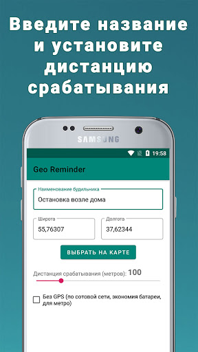 Будильник, основанный на геолокации (GPS). С ним Вы никогда не пропустите нужную остановку. Нажмите 'Добавить будильник', введите координаты или выберите точку на карте, отметьте созданный будильник как активный и при приближении он разбудит Вас. Геолокация включается периодически, что экономит батарею. Для определения положения используются и данные GPS, и данные сотовой сети - это обеспечивает работу будильника в подземном метро