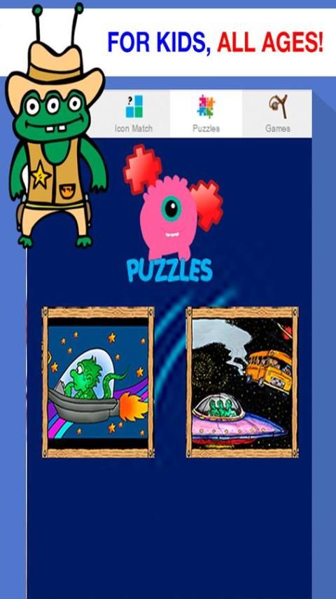 The next spray of fun in the Alien app game for children is the cool Alien children's puzzles. These awesome Alien games are super fun and are made for children and are designed for ages 4 & up and have no time limit or sound element, so your little ones can concentrate while they play, just like when they are building a real puzzle. They are engaging fun and playing the Alien sounds kids puzzles also encourages: