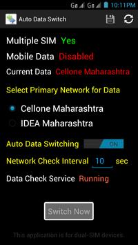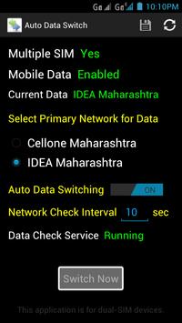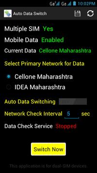 This application is useful for dual-SIM devices having data plan active on both the SIMs. This app helps you to switch data between two networks. You can set one of the networks as a Primary Network and provide some duration value for data check interval and save the preferences. A Data Check Service would be started in background which checks for availability of the networks. If primary network goes down the mobile data will be automatically switch to another network. Once the primary network is available again the data will be switched back to the primary network. You may prefer to keep the service off and use Switch Now functionality to switch the network manually anytime. This is primarily developed and tested with Karbonn mobiles available in India and may not work on other phones.