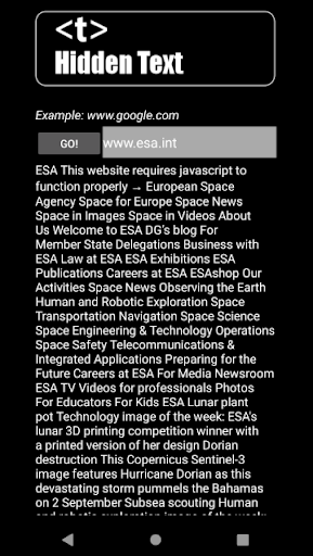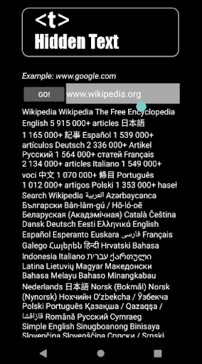 With this application you can search for all the hidden texts which are in Internet! It is vert easy: 1. Download the application 2. Open Hidden Text 3. Enter a link from a web Page and Go!