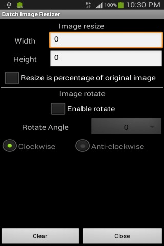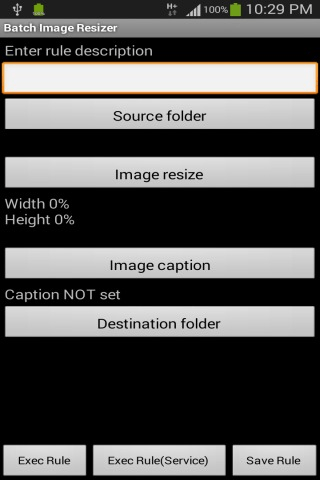 For some people who has a need to resize images in batches of many, this app is to serve the need. To configure, set the input folder (at least one), image resize width and height, output folder (one). Tap Execute Rule to start resizing those images fulfilling the criteria or tap Save Rule to save the configuration to be re-used later. Important points to note: - Only images of JPG,PNG can be resized as provided by Android SDK - If you wish and want to be extra safe, make a copy of the folder you set to resize images so you can recover your files if the app resize the images wrongly The application support English, Simplified Chinese, Traditional Chinese display.