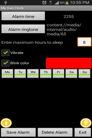 For people who have this strange habit of sleeping too many hours will make you sleepy affecting your life next day. This app is unique as in besides setting the alarm time, you will also set the maximum hours to sleep. So every night, before sleeping, you will tap on the app widget to let the alarm re-calculate when should the alarm rings. The app alarm will not be scheduled beyond the alarm time you have set. E.g You set alarm time at 0700 and maximum sleep hours as 8. If you tap widget at 2300 the night before you sleep, the app alarm will ring at 0700. If you tap the widget at 2200 the night before you sleep, the app alarm will ring at 0600 instead as you set the maximum sleep hour to 8. If you tap the widget at 2330 the night before you sleep, the app alarm will STILL ring at 0700 instead despite you set the maximum sleep hour to 8. Within main app, set your own alarm time, maximum hours to sleep and then tap Save Alarm. To get the widget on home screen, long tap on Home screen -> Widgets -> My Own Clock. Important points to note: - The alarm time will only be scheduled when you tap the widget. This is needed for the app to re-calculate the alarm time based on the time you sleep by tapping the widget. The application support English, Simplified Chinese, Traditional Chinese display.
