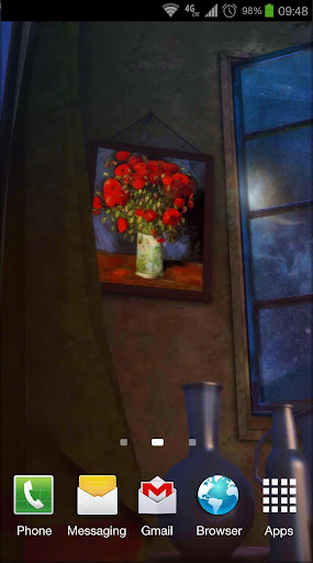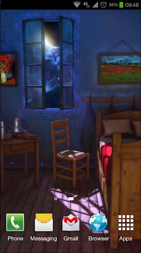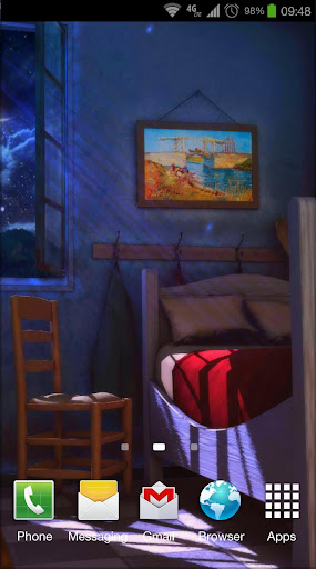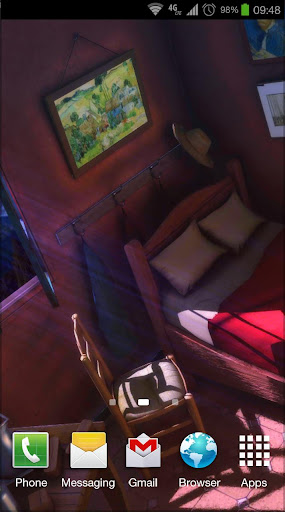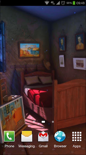 Одна из самых знаменитых картин в мире "Спальня в Арле" Винсента ван Гога воссоздана в полном 3D, чтобы Вы насладились этим искусством на экране Вашего телефона! Они настолько реалистичны, что Вы будете чувствовать себя сидящим посреди этой комнаты! Эти живые обои включают в себя огромное количество замечательных настроек, в том числе изменение картин (большая часть из них - Ван Гога), стен, двери, и даже материала пола! И так, Вы сами можете сконструировать комнату Ван Гога так, как Вам кажется, ему будет удобно работать и творить.