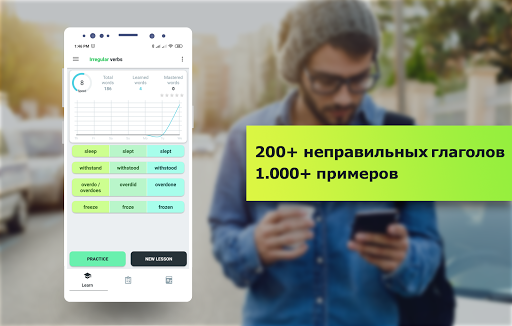 Методика обучения, примененная в приложении, позволяет быстро учить слова. В английском языке существует несколько сотен неправильных глаголов. Здесь мы постарались собрать около двухсот, которые наиболее часто употребляются как в бытовой английской лексике, так и в популярных и специализированных ресурсах (National Geographic, TED, British Council и т.д.), периодических изданиях (People, Forbes, The Economist, Oxford University Press и т.д.), популярных фильмах и сериалах (Interstellar, Joker, The Big Bang Theory, Breaking Bad, Friends и т.д.). С помощью данного приложения Вы сможете быстро выучить новые слова английского языка, расширив словарный запас, и улучшить свой разговорный английский. Эти знания откроют для Вас качественно новые возможности общения на английском языке. Мы структурировали материал по уровням сложности, стараясь сделать процесс обучения максимально интересным и эффективным.