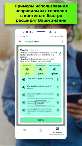 Словарная карточка для каждого неправильного глагола в этом приложении содержит набор времен глагола, полное толкование на английском языке, перевод на русский язык (и десятки других языков), множество примеров использования, пример произношения с разными акцентами (американский английский, британский английский, австралийский английский, индийский английский) и другие детали, необходимые для их качественного изучения и погружения в тему. Благодаря уникальной методике обучения Вы запомните изучаемый материал очень и очень надолго.