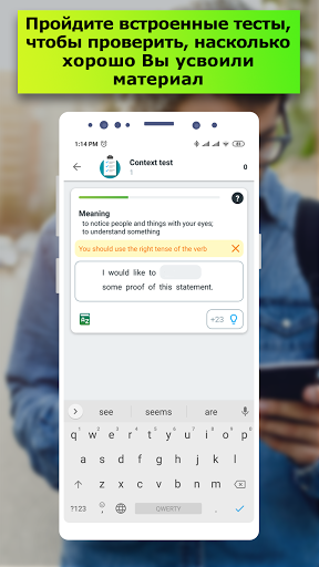 Во время обучения Вы сможете проверить свои знания, проходя тесты на проверку знаний всех форм неправильных глаголов. После прохождения теста, приложение рассчитает уровень полученных Вами знаний, что даст стимул и дальше учить английский язык, открывая для себя всё новые горизонты.