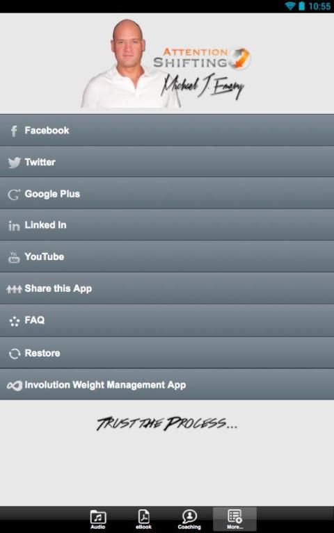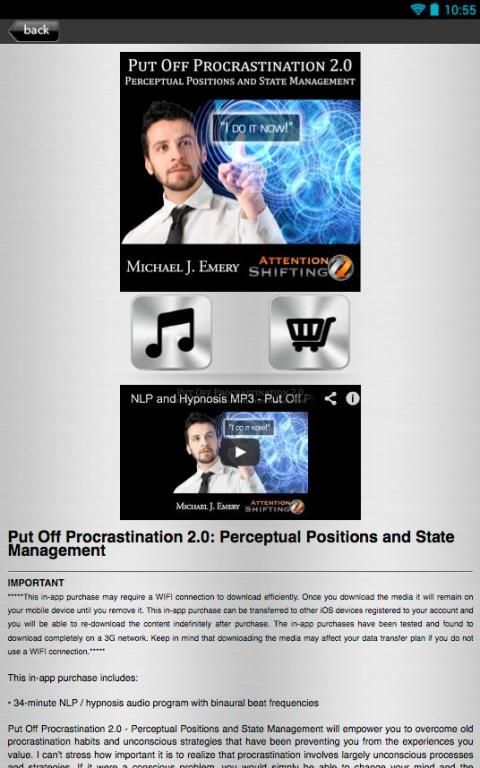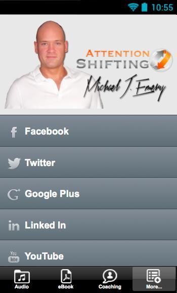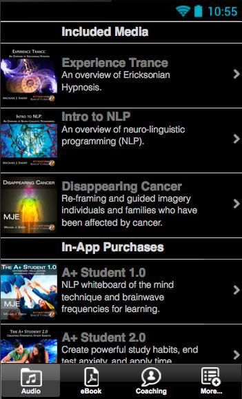 Следующие аудио-программы доступны как в приложении покупки, и каждый из Вниманию Сдвиг личные программы развития уникальный процесс, чувствовать и подход предназначен для расширения возможностей слушателя. Эти звуковые программы используют НЛП (нейро-лингвистическое программирование), Ericksonian гипноза, медитации, бинауральные ритмы, мозговых частот, и руководствуясь визуализации и образы, чтобы помочь впечатления слушателя личной трансформации.