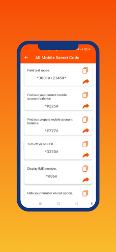 Samsung Secret Code - это базовое приложение Android, которое включает в себя короткий код, который пользователь может использовать этот код для информационного устройства. Теперь вы можете обнаружить секретный мир вашего, Android и других мобильных мобильных устройств ОС!устройства.Некоторые из них могут не работать на определенных устройствах, но вы все равно можете попробовать их, потому что их производитель не допускает их.Когда эти коды вводится вручную из телефона, вы можете скопировать этот код с длинным нажмите на код и вставить его в буфер обмена.В приложении также существуют функциональность, чтобы поделиться им с Facebook, Twitter, WhatsApp и другими другими другими социальными приложениями. Все мобильные секретные код
