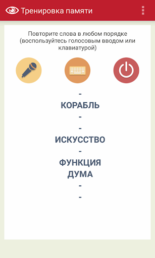 Наше приложение предназначено для развития зрительной памяти человека. За заданный Вами промежуток времени необходимо запомнить определённое количество слов. После окончания времени Вы должны воспроизвести все эти слова в том же порядке. Поддерживается голосовой ввод по одному слову или всех слов сразу.