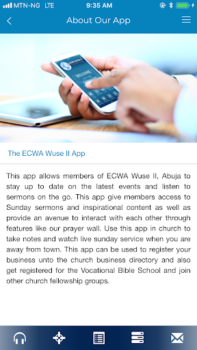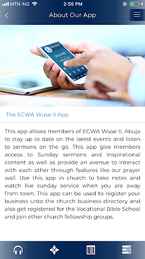ECWA Wuse II official App to keep members of the church up to date with latest events and listen to sermons on the go. This app gives members access to Sunday sermons, inspirational content and a medium of fellowship and sharing among members