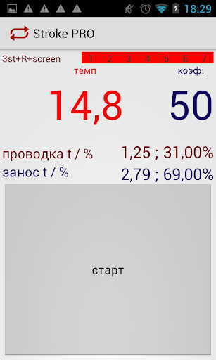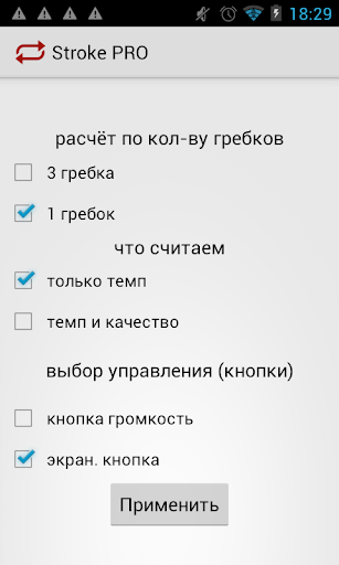 Программа для подсчёт темпа. 1. Подсчёт темпа за 1 или 3 гребка. 2. Подсчёт просто темпа или темпа качество (расчёт отдельных значений заноса и проводки - в секундах и процентах). 3. Возможна работа как с экранной кнопкой, так и с кнопкой громкости.
