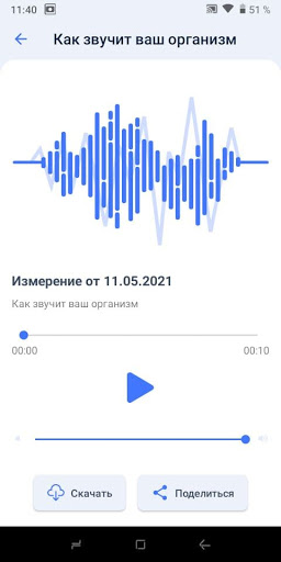 3. Приложение BodySound анализирует измеренную пульсовую волну и формирует звуковой файл, который вы можете прослушать или поделитья с друзьями и близкими